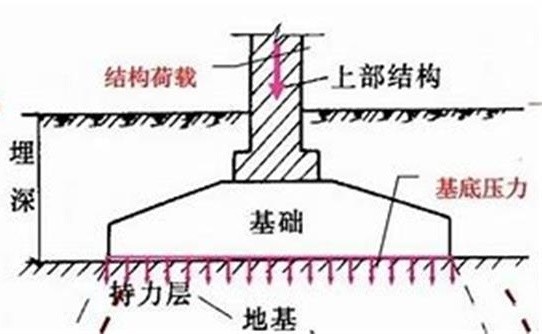地基是指建筑物下面支撑基础的土体或岩体。作为建筑地基的土层分为岩石、碎石土、砂土、粉土、黏性土和人工填土。 基础是指建筑物地面以下的承重结构,如基坑、承台、框架柱、地梁等。是建筑物的墙或柱子在地下的扩大部分,其作用是承受建筑物上部结构传下来的荷载,并把它们连同自重一起传给地基。